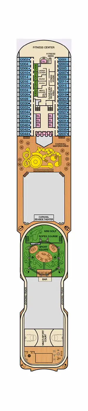 Dos camas bajas convertibles en una cama King. Colchones de diseño exclusivo para Carnival. Ventanales, terraza exterior, ropa de cama de hilado superior. Amplio cuarto de baño con ducha, sala de estar. Productos de baño, suaves alfombras, control climático, teléfono, TV con canales internacionales. Servicio nocturno de preparado de cama incluyendo chocolatina o galletas con chispa para los niños.