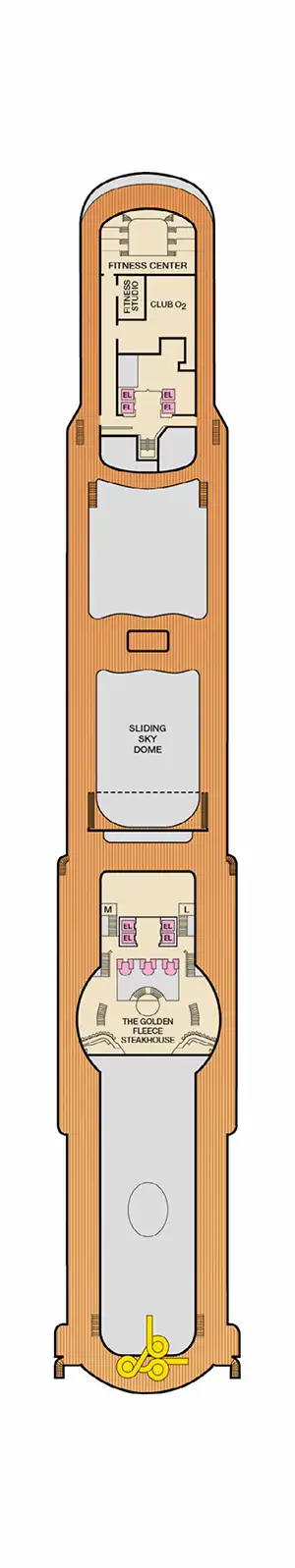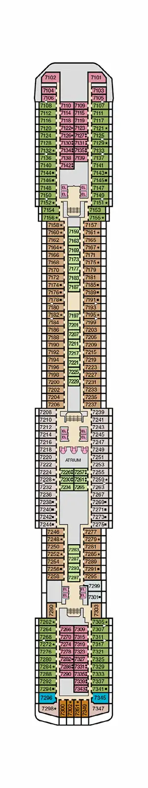 Dos camas bajas convertibles en una cama King. Colchones de diseño exclusivo para Carnival. Ventanales, terraza exterior, ropa de cama de hilado superior. Amplio cuarto de baño con ducha, sala de estar. Productos de baño, suaves alfombras, control climático, teléfono, TV con canales internacionales. Servicio nocturno de preparado de cama incluyendo chocolatina o galletas con chispa para los niños.