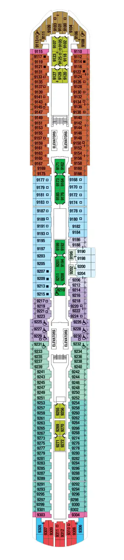Ventanal de altura completa con balcón privado. Situado en una posición central para un fácil acceso a todas las cubiertas. Un número limitado de camarotes ofrece esta vista única. Nueva Colección Cashmere con colchón king size de lujo. Dos camas individuales inferiores convertibles en una cama King (salvo que se indique lo contrario). Algunos camarotes pueden tener una cama supletoria. Doble voltaje 110/220 AC. Amplio espacio de almacenamiento en tu baño y armario.