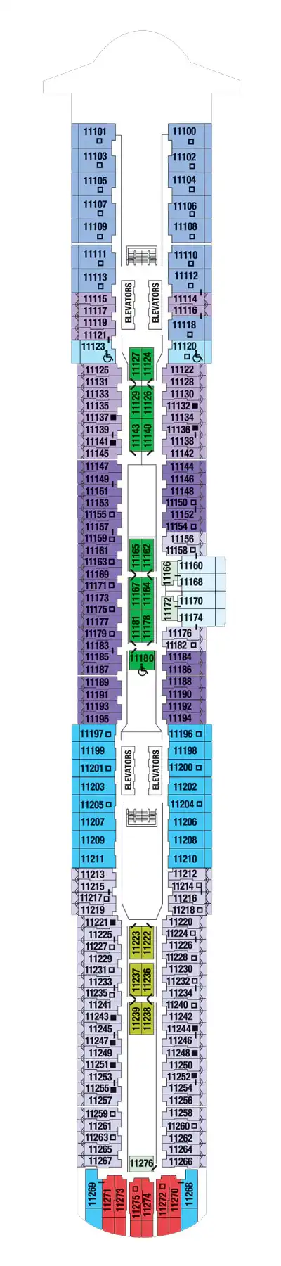 Ropa de cama eXhale™ de Celebrity con colchón de cachemir. Dos camas inferiores individuales convertibles en king. Algunas cabinas pueden tener una cama abatible. Doble voltaje 110/220 V CA. Amplio espacio de almacenamiento en su baño y armario. Smart TV, caja fuerte individual y mini refrigerador.