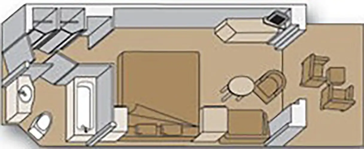 Aprox. 35m², balcón incluido. 2 camas bajas que forman 1 cama tamaño queen, baño con tocador de lavamanos doble, bañera y ducha grande con hidromasaje y ducha adicional, amplia sala de estar, terraza privada, 1 sofá cama para 1 personas, ventanas panorámicas. Incluye todas las comodidades del camarote más variedad de almohadas, minibar a su cargo, toallas de baño extragrandes, servicio telefónico de conserjería, biblioteca de DVD de cortesía