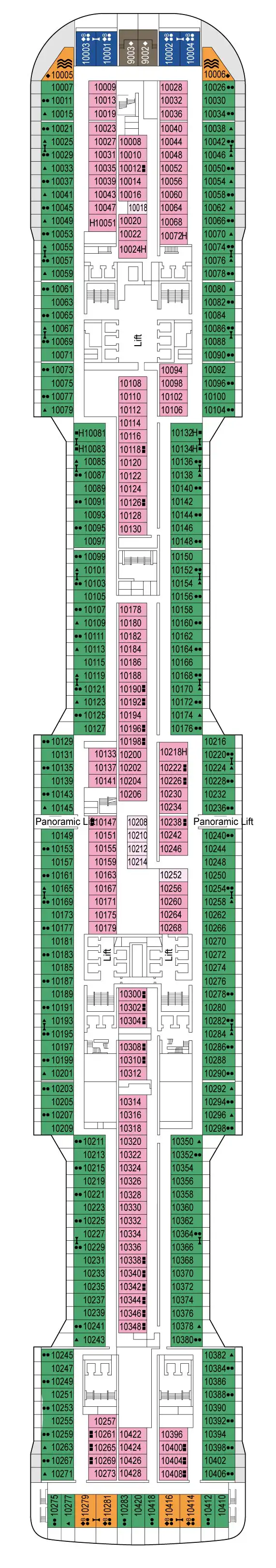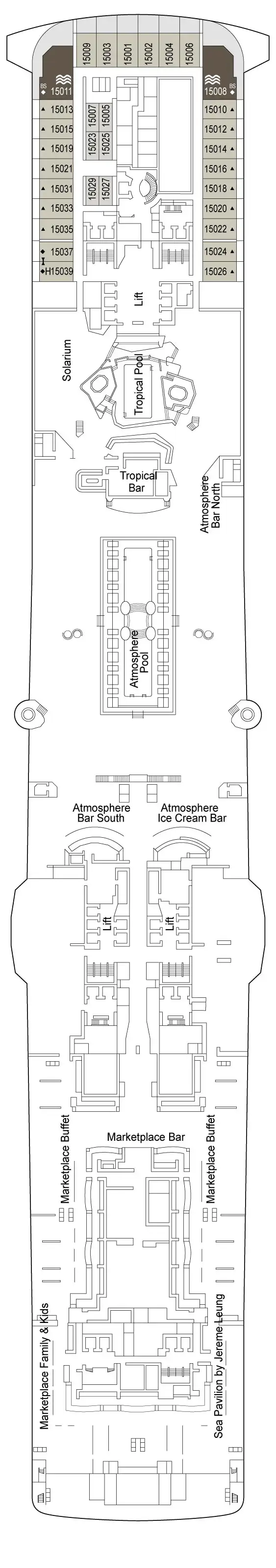 Superficie aproximada de 58 m², balcón de aproximadamente 70 m², cubierta 15 Balcón con jacuzzi privado y mesa de comedor. Sala de estar y comedor separados vestidor Cuarto de baño con bañera y ducha, rincón de belleza con secador de pelo. Cómoda cama doble o dos camas individuales (bajo petición) wifi incluido TV interactiva, aire acondicionado, teléfono, caja fuerte y minibar.