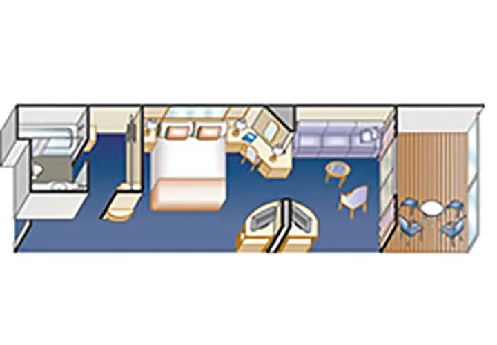 Esta impresionante cabina ofrece la elegancia de un balcón con finos muebles de terraza. Otras amenidades incluyen un armario espacioso, escritorio y un baño con ducha. Aproximadamente 22-26 metros cuadrados, incluyendo el balcón.