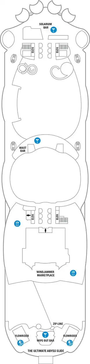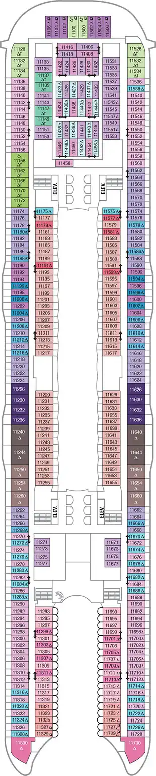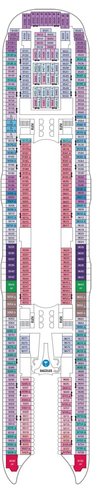 Todos los camarotes están equipados con baño privado completo, tocador, secador de pelo, televisión de circuito cerrado, radio y teléfono. 2 camas bajas convertibles a queen-size. Vistas hacia Boardwalk (17m2, balcón 5m2). Algunos camarotes tienen vista obstruida.